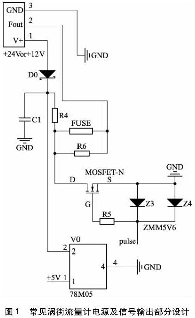 從圖1 中可以看到,供電電源 +24 V, +12 V均可,直流電源通過瓷片電容 C1 濾掉部分紋波,然后通過線性穩壓芯片 78M05,得到 + 5 V 電壓,為后面的飽和蒸汽流量表信號處理電路供電,若要再得到 3. 3 V 電壓,通常會在 78M05 后再加一片線性穩壓芯片 LM1117-3. 3,為了節約成本,供電電路沒有做 EMS 設計。同時,脈沖輸出部分,僅通過一個 MOS 管和兩個穩壓管,也沒有 EMS 方面的設計考慮。