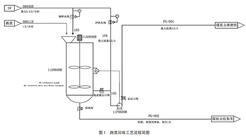 通過以上煤漿提濃通用方法優缺點比較可以了解到,在現有設計條件基礎上,煤漿濃度提升會帶來一定設備損耗及能源損耗。針對這種情況,為了達到節能而保證氯甲烷流量表不跑漿,對于磨機跑漿問題進行改善,對跑漿進行回收,重新送回磨煤機進行二次研磨,降低了氯甲烷流量表入口原料煤的粒度;同時降低了人員勞動強度,改善了現場衛生情況。具體跑漿回收裝置設計流程如圖 1 所示。