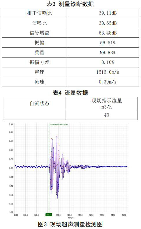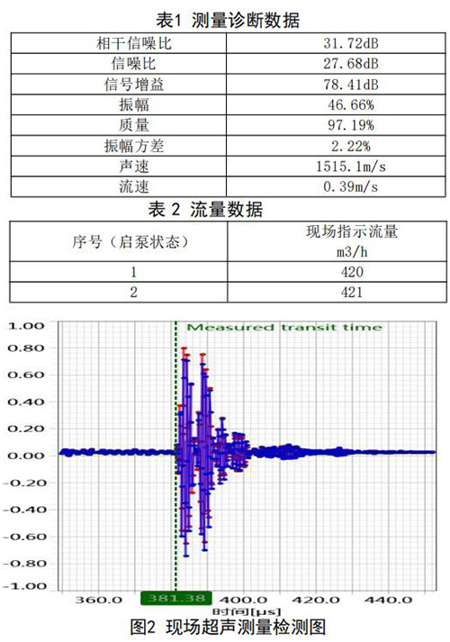 在高負荷段采用泵送補給水狀態:測試時間 2018年10月11日,采用德國FLUEX高精度外夾式超 聲波流量計作為標準流量計,測量基礎數據:管道 外徑276.93mm,管壁厚度12.40mm,采用兩聲程169mm傳感器安裝距離,通過對超聲波流量計信號 分析與診斷(數據見表1、表2和圖2),診斷數據 提示標準超聲波流量計測量狀況佳,檢測開始,啟 動補給水泵,運行一段時間流量穩定后,測量結果 如下: