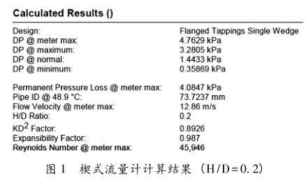 (4)根據(jù)工藝要求及現(xiàn)場安裝環(huán)境選擇耐壓、耐溫等級、防護等級、防爆等級、輸出信號等。3測量熱解氣的渦街流量計的選型設(shè)計熱解氣的組分如表1所述,其工藝參數(shù):操作密度0.63kg/m3,運動粘度2×10-5m2/s,操作溫度48.9℃,操作壓力7.5kPa,管道DN80,*小流量50Nm3/h,正常流量100Nm3/h,*大流量150Nm3/h,儀表測量范圍選擇0~180Nm3/h。因為本裝置為試驗裝置,在裝置運行的過程中,業(yè)主可能會根據(jù)需要適當(dāng)調(diào)整參數(shù),因此選擇量程比寬一些的流量計會有助于調(diào)整后的測量;另外熱解氣作為產(chǎn)品之一,其流量是驗證工藝與關(guān)鍵設(shè)備的工程可行性、優(yōu)化工藝參數(shù)的關(guān)鍵參數(shù)之一,因此使用精度高一些的流量計也是有必要的;熱解氣的組分隨著參數(shù)的調(diào)整也可能會發(fā)生變化,因此基于伯努利方程原理的,如孔板、噴嘴、阿牛巴、德爾塔巴、平衡式等都不能很好的測量,因為這類流量計受流體物性(密度、粘度)和組分變化影響,且*終的熱解氣產(chǎn)品或多或少都有焦油的存在,時間長了可能堵塞流量計。楔式流量計帶自清潔的功能,如果采用法蘭取壓,變送器采用隔膜密封式變送器,其受焦油的影響較小,楔式流量計的計算結(jié)果分別見圖1和圖2。