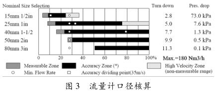 從圖3可見,出流量計口徑為DN80時,*小流量無法測量;流量計口徑縮徑至DN50時,*小流量可測(此時流體的雷諾數(shù)非常接近2×104),但此時的測量精度稍微差些;流量計口徑縮徑至DN40時,*小流量可測,且精度也能得到保證。用上述公式計算的壓損與軟件計算出來的也基本一致,差別來自計算時流速及流量計口徑均采用的是估算值。如果流量計縮徑至DN25時,流量計的壓損已經(jīng)達到7.6kPa,壓損較大,無法滿足工藝要求。因此選擇DN40口徑的流量計能滿足要求。對于DN50口徑的方案,如果流量大于54Nm3/h時,流量計的精度為此款流量計的*佳精度,為1.0%,當(dāng)流量為50Nm3/h時,此時流量可測,只是精度稍差些,約為1.81%,但流量計的壓損會小很多,從節(jié)能降耗方面考慮,選擇DN50口徑的流量計也是可以的。綜上,選擇DN40和DN50口徑的渦街流量計都能滿足要求。