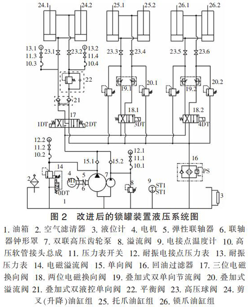 (4)液壓元件選型不合理。原液壓系統(tǒng)中選用 O型機(jī)能換向閥來(lái)實(shí)現(xiàn)在其行程的任意位置處對(duì)油缸組鎖緊,由于滑閥式換向閥的泄漏現(xiàn)象不可避免,僅適用于時(shí)間短且要求不高的回路,此鎖緊方式可靠性差。 另外本裝置安裝于惡劣的礦山環(huán)境下,由于缺乏回油過(guò)濾器,惡劣的礦山環(huán)境將會(huì)對(duì)系統(tǒng)油液嚴(yán)重污染,加重系統(tǒng)泄漏進(jìn)而失去保壓功能。