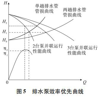 當執行多臺排水泵同時運行時,通過排水泵特性曲線與管路特性曲線的比較,選擇非常好的匹配排水泵與排水管數量,保證排水泵在非常好的新效率點運行。如圖 5 所示。