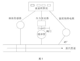 蒸汽作為重要的二次能源廣泛應用于工業生產當中。蒸汽的計量是蒸汽使用過程中重要的一環,蒸汽流量計的準確性關系到供、用雙方的經濟利益。蒸汽流量計又是由多個計量器具組成的一個計量系統。而蒸汽流量計大都安裝在高溫、高壓的蒸汽管道上,不方便拆卸,如何提高蒸汽流量計現場檢測技術就變得非常重要。目前常見的用于計量蒸汽的流量計一般有兩種:渦街流量計和差壓式流量計。渦街流量計主要由渦街流量傳感器、流量積算儀、壓力變送器、溫度鉑熱電阻組成。差壓式流量計主要由標準孔板、差壓變送器、流量積算儀、壓力變送器、溫度鉑熱電阻等組成。渦街流量計由于其結構簡單、牢固、安裝維護方便。目前在市場上的應用越來越廣泛。渦街流量計安裝示意圖如圖1: