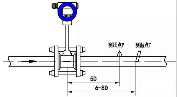 注:測壓孔和測溫孔的安裝設計。被測管道需要安裝溫度和壓力變送器時,測壓孔應設置在下游3-5D處,測溫孔應設置在下游6-8D處。