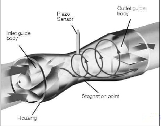 旋進漩渦流量計的原理:旋進旋渦流量計是在文丘里管的前面加了一個起旋器,產生一次漩渦,再經過文丘里管產生二次漩渦,二次漩渦的漩渦頻率與流體流速成正比