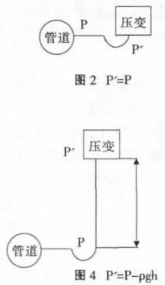 建議采用圖2的安裝方式,如不得已需要選擇圖3、圖4的安裝方式一定要對壓力進(jìn)行補(bǔ)償。不建議按照圖5的方式安裝,因?yàn)闊o法確定P'與P的關(guān)系。