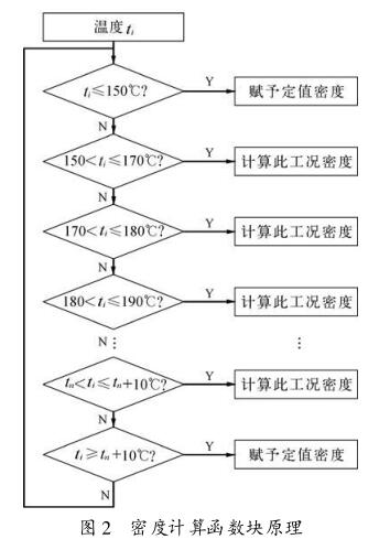 定義密度計算程序是蒸汽壓力0.4~0.5MPa的一個函數,以相同的方法定義0.5~0.6MPa,0.6~0.7MPa,一直到0.9~1MPa等若干個函數,這里不再重復。通過對壓力值范圍的判斷調用相應的函數,就可以得到較為準確的密度值。程序框圖如圖1,圖2所示,pi為蒸汽壓力,ti為蒸汽溫度。