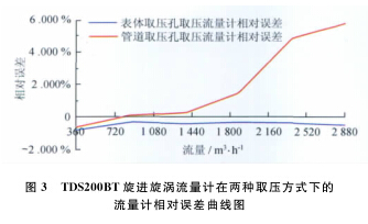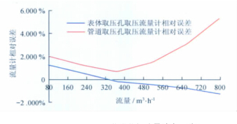 從以上數據表和曲線圖中可以看出:甲烷計量表型號一定的情況下,用表體取壓孔取壓方式檢定流量計時流量計的線性度較好,用管道取壓孔取壓方式檢定流量計時流量計的線性度較差;流量測點相同的情況下,表體取壓孔取壓檢定方式的流量計誤差較小,管道取壓孔取壓檢定方式的流量計誤差較大;兩種取壓方式引起的誤差隨著流量的增大而逐漸增大,在流量為2 900m3/h時兩者相差近6.2%,遠遠超出了流量計的準確度等級。所以,在甲烷計量表的檢定過程中,應避免在流量計表體取壓孔以外的地方取壓進行檢定。